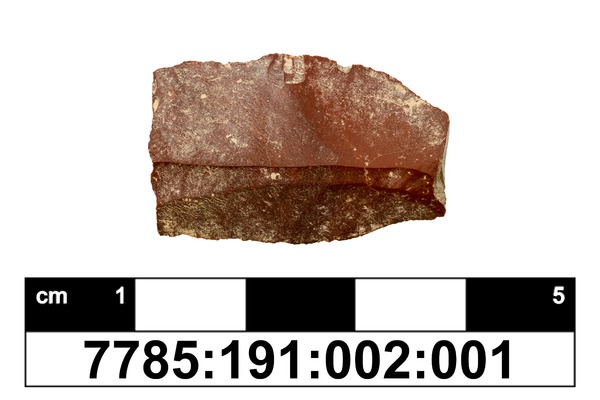Klinge aus einfarbig weinrotem Honrstein mit zwei scharfen, unretouchierten Kanten und flachem trapezförmigem Querschnitt bei leicht gewölbter Unterseite