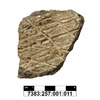 Exterior brown oxidized surface, interior and fabric until exterior denied oxygen. Chaff and stone inclusions. Incisions criss-cross the surface of the piece and were clearly done when the clay was still quite wet. (Shannon Martino)