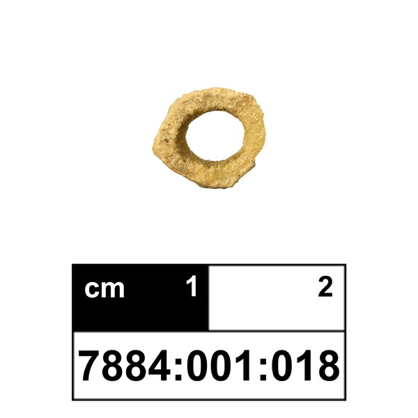 An einer Seite abgeschnittenes, an der der anderen abgebrochenes Fragment eines kleinen Röhrenknochens (?), der vielleicht als Perle aufgefädelt und in einer Kette getragen wurde. Die ringförmige Perle (?) ist unregelmäßig dick und ihre Oberfläche ist ebenfalls mit Kanten versehen. Nur die innere Öffnung ist gleichmäßig oval.