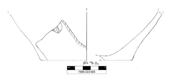 Flachboden eines relativ dünnwandigen, sandgemagerten Topfes mit einer grob hinein geschlagenen, rundlichen Öffnung in der Bodenmitte