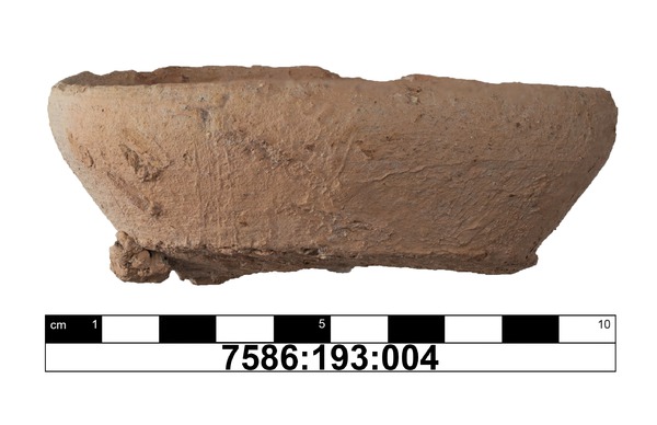 Vollständig erhaltenes Schälchen mit minimal abgesetztem Flachboden, ca. 60 Grad ansteigender Wandung und leicht nach innen gebogenem, zugespitztem Rand; das Gefäß ist nicht gleichmäßig rund, sondern oval - eine Folge des flüchtigen Produktionsprozesses (s. Schälchenexperiment 2014). Abdrehspruen und nicht abgearbeitete Tonreste auf der Unterseite; zwei tiefe und 4 flache keilförmige Eindrücke auf der Oberfläche unterhalb des Randes. Der Boden hat einen leichten Riss, so dass er nicht geschlossen bzw. undicht ist. Innen möglicherweise von Brandschutt gezeichnet. Im Zentrum des Bodens ist die Oberfläche leicht abgeplatzt.