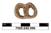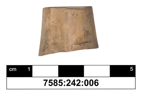 Schaftfragment eines Metapodiums von Schf./Zg. (?) , das an beiden Seiten abgesägt wurde.Die Oberseite trägt zudem einen Einschnitt, der anzeigt, daß zunächst an der falschen Stelle gesägt wurde oder die Säge eventuell abgerutscht ist und man von neuem begonnen hat.An der breiteren Seite ist die Oberfläche ganz glatt, d.h. sie wurde nach dem Sägen noch nachbearbeitet/geglättet.An der schmaleren Seite splitterten Teile des Knochens ab. Die Benutzung dieses Objektes ist unklar. Mglw. ist es ein Rest,der weggeworfen wurde, während die abgesägten distalen und proximalen Enden benutzt wurden.