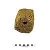 Pyramidales handgeformtes Webgewicht mit stellenweise stark bestoßener Oberfläche, quadratischer Basis und rechteckiger Oberseite; der Ton entspricht dem Ton aller Webgewichte;