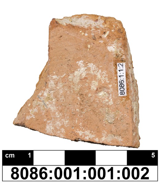 Unbestimmbares Wandungsfragment aus hellbraunem Ton, der mittelviele mineralische Einschlüsse von mittlerer bis grober Größe enthält, es sind einige Kalkeinschlüsse identifizierbar.