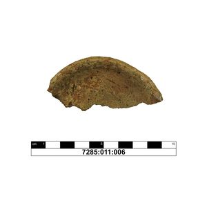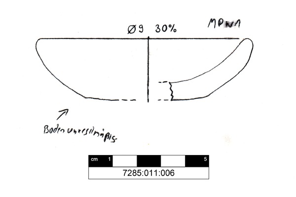 Schalenfragment mit einfach gerundetem Rand und unregelmäßigem Flachboden; tongrundig; Drehrillen; oxidierender Brand;Tonfarbe 7,5 YR 5/4 brown