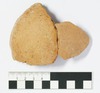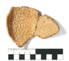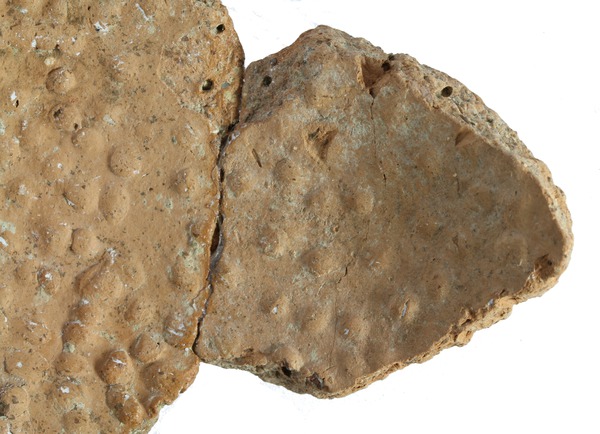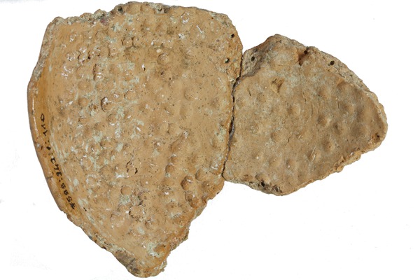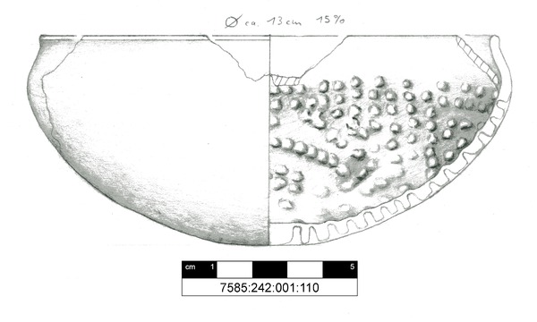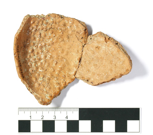 Zwei zusammenpassende Fragmente einer kleinen Kalottenschale, die auf der Innenseite zahlreiche Noppen aufweist. Diese beginnen ab etwa einem Zentimeter unterhalb des Randes, wo sie sehr dicht gesetzt sind, und erstrecken sich dann etwas lockerer verteilt über den ganzen erhaltenen Bereich des Fragmentes, der auch den Boden umfasst. So kann davon ausgegangen werden, dass, abgesehen von einem kleinen Bereich unterhalb des Randes, die ganze Innenseite der Schale ursprünglich mit Noppen versehen war. Die Noppen haben einen Durchmesser von ca. 2-3 mm und eine Höhe von ca. 1 mm. Abgesehen von der unterschiedlichen Dichte ist keinerlei Muster erkennbar. Die Herstellung der Noppen kann über Spuren an den Bruchstellen erfasst werden und wurde im Rahmen eines kleinen Experimentes herausgefunden: Bei den Noppen, die durch die Bruchstellen geteilt worden sind, konnte sehr häufig ein länglicher Hohlraum beobachtet werden. Dieser ist nur erklärbar, wenn die Wandung des noch nicht gebrannten Gefäßes von außen mit einem Objekt durchstochen wird, so dass Noppen auf der Innenseite entstehen und anschließend die Stelle an der Außenseite wieder verstrichen wird. Dabei muss das Gerät eine kleine gerundete Spitze aufweisen und der Ton muss noch feucht sein. So ist davon auszugehen, dass die Herstellung der Noppen unmittelbar nach der Herstellung auf hsehr unregelmäßig, so dass das Gefäß wie handgemacht aussieht. Es scheint aber auf der Drehscheibe hergestellt worden zu sein.