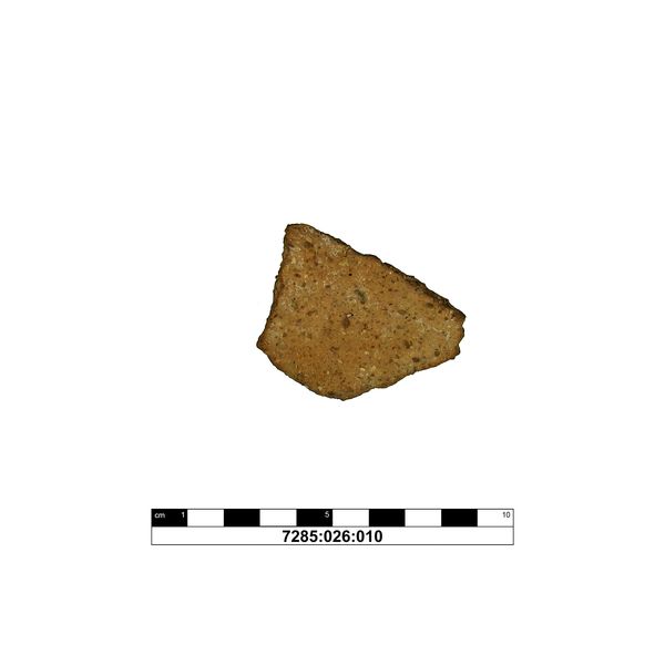 Wandstück eines mineralisch gemagerten, außen gesliptenTopfes und oxidierend gebrannten (?) mit einem umlaufenden ritzverzierten und gestempelten Dekorband im Schulterbereich (?); die Verzierung besteht aus 3 unterschiedlichen Bändern, die durch eine bzw. zwei parallele Ritzlinien voneinander getrennt werden. In der Mitte befindet sich ein 1,46 cm breiter Streifen, der aus einer fortlaufende Reihe von 1,12 cm großen Kreismotiven besteht, die von 3 eingedrückten, ineinandergeschachtelten konzentrischen Kreisen mit mittlerem Auge gebildet werden. Der Abstand zwischen den Kreisen (Augen?) variiert zwischen 0,32 und 0,42 cm. Das Augenband wird nach oben durch eine einfache Ritzlinie begrenzt. darüber befindet sich eine umlaufende Reihe von parallelen, senkrechten Fingernagel-einkerbungen. Nach unten wird das Augenband von einer doppelten Ritzlinie begrenzt. Darunter schließt sich ein 1,16cm breiter Streifen mit flach eingedrückten, vertikalen Dreiecken an, die nach unten von einer weiteren umlaufenden Ritzlinie begrenzt werden.