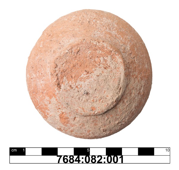 Vollständig erhaltenes flaches Schälchen mit abgesetztem Flachboden und gerundetem Rand. Der Randdurchmesser ist nicht kreisrund, sondern an einer Seite leicht eingedrückt (Dm-Rand hier: 7,25 cm). Zur Hälfte versintert und Sinter absichtlich nicht entfernt.