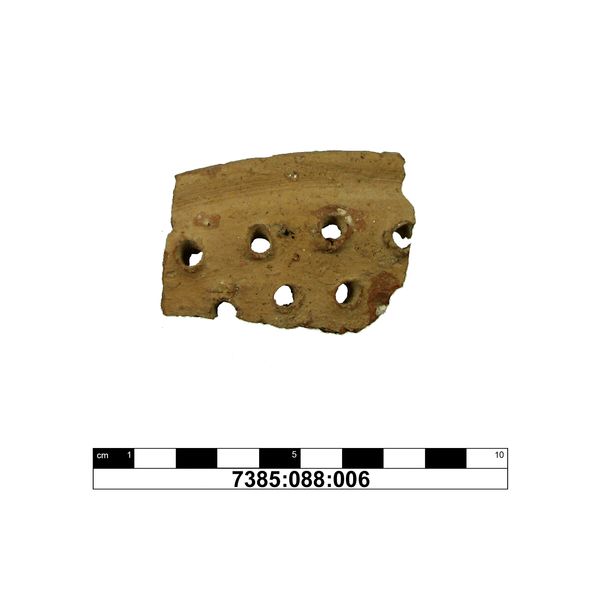 Fragment eines schalenförmigen Siebgefäßes; auf der Außenseite leicht abgesetzter, verdickter und gerundeter Rand mit Halbrunden Eindrücken in der Oberseite; die Perforierung (Loch-Dm: 0,4 cm) beginnt ca. 1,7 cm unterhalb des Randes; die Oberflächen weisen Drehrillen auf. Das Fragment bestitzt einen gleichmäßigen Überzug (Munsell 7.5YR 8/3). Der Kern weißt eine gräuliche Färbung auf (Munsell 7.5YR 6/1). Es ist eine weißliche Magerung zuerkennen.