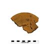 Fragment einer kleinen steilwandigen Schale mit leicht nach außen gebogenen, gerundetem Rand und unregelmäßigem Flachboden; kurz oberhalb des Boden sind Spuren einer Schnur zu erkennen, mit der das Geäß vom Stock abgeschnitten worden ist; möglicherweise ist der erste Ansatz zum Schnitt zu hoch angesetzt worden und hat sich deshalb erhalten; stellenweise schwarze Brandflecken; oxidierend gebrannt mit grauem Kern; nur in Bodenmitte ist der scherben vollständig durchgebrannt.
