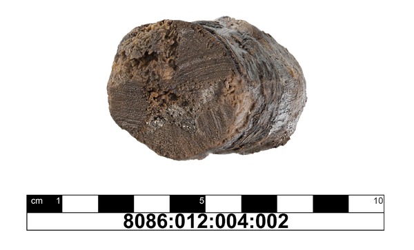 2,8-3 cm messendes Astfragment mit tw. erhaltener Rinde, dessen eines Ende abgebrochen ist, dessen anderes Ende jedoch mit einem kleinen Beil abgehackt wurde. Dies geschah nicht durch einen einzigen Schlag, sondern durch 4 Schläge, die jeweils 1,2 cm in das Holz hineinreichten und schließlich ein sauberes Abtrennen ermöglichten.