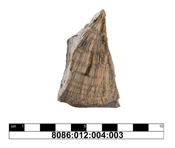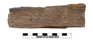 Keilförmiges Fragment eines Baumstammes mit entrindeter glatter Außenseite und sichtbarer Faserstruktur an den natürlich belassenen Flächen; während eine Schmalseite abgebrochen ist, zeigt die andere Spuren künstlichen Abtrennens (ca.10-13 Ringe erkennbar)