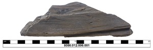 Trapezförmiges Holzstück mit einem kleinen Stück erhaltener, aber verbrannter Rinde sowie einem stufenförmig (abgebrochenen?) und einem schräg abgesägtem Ende. Der Sägevorgang geschah in 2 Abschnitten, die durch einem allmählich bis zu 0,6 cm ansteigenden Absatz voneinander getrennt sind.