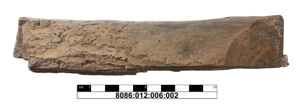 Etwas weniger als ein Viertel eines runden Stammes mit glatter, rindenfreier Oberfläche, die nahe des abgebrochenen Endes stellenweise zersetzt ist. Das andere Ende wurde mit einem Gerät (Säge?) in vier plus X Abschnitten durchtrennt. Der erste Abschnitt ist 2 cm, der zweite 2,7 cm breit: Abschnitt 3 ist etwas höher und nur 0,5 cm breit. Der vierte, nochmals höhenmäßig (ca. 1 mm) etwas abgesetzte Abschnitt blieb lediglich auf 1,0 x 0,7 cm erhalten.