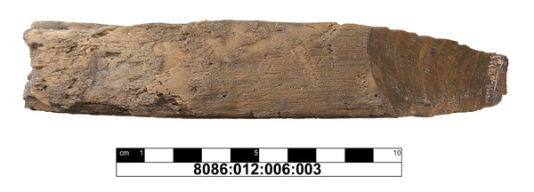 Schmal keilförmiges Holzfragment mit einer 3,2 cm breiten, glatten und rindenfreien, aber teilweise zersetzten Oberfläche eines runden Stammes; ein Ende wurde wahrscheinlich gerade abgebrochen, während das andere Ende schräg abgesägt wurde. Allerdings wurde der Stamm in mehreren Abschnitten (5,2 cm - 1,8 cm - 1,1 plus x cm) durchgesägt. Der innerste Abschnitt ist um ca. 1 mm erhöht.