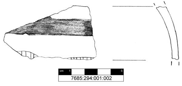 Die Bemalung (Munsell colour: 10R 4/4) stellt eine horizontale breite Linie dar. Möglicherweise geht oberhalb eine diagonale Linie ab.