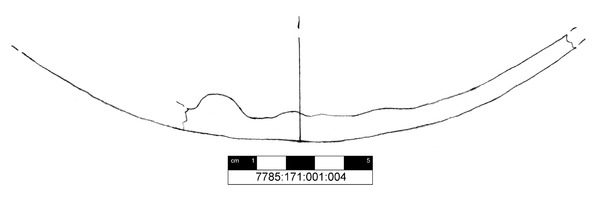 Rundboden mit stark ausgeprägten und Drehspuren am inneren Gefäßboden. Auf der Außenseite ist das Fragment geglättet und besitzt eine unregelmäßige Oberfläche. Die Innenseite ist gräulich reduzierend gebrannt und mit Kalksinter überzogen.