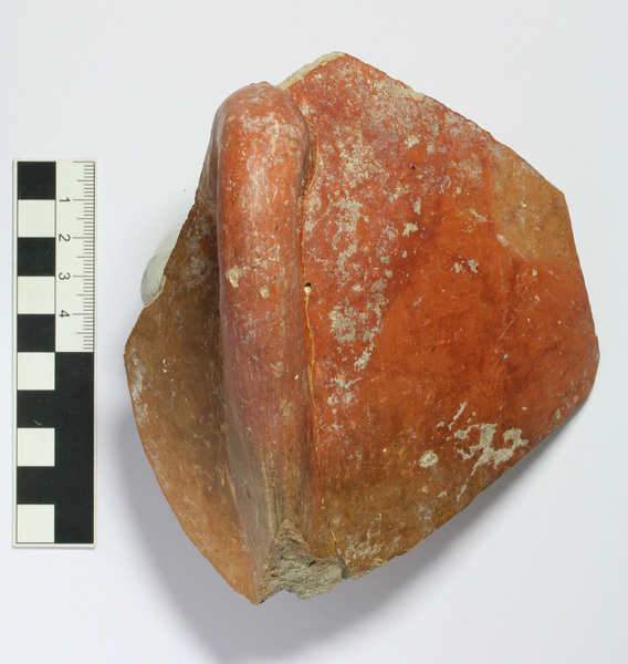 Wandfragment einer großen Linsenflasche mit vollständig erhaltenem Henkel (Typ He6). Die Innenseite ist nicht durchoxidiert und leicht reduzierend gebrannt. Schlampig aufgetragener roter Überzug.