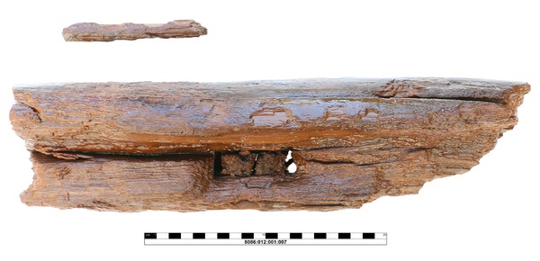 Erheblich beschaedigtes Bruchstück des Steges aus sehr weichem, fragilen Holz