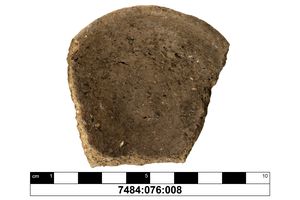 Schälchen mit leicht nach außen gebogenem, zugespitztem Rand und Flachboden; die dunkelgraubraune Färbung auf der Innenseite könnte durch die Lagerung im Boden beeinflußt sein; Magerung und Außenseite sind deutlich heller;
