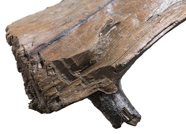 Grosses Rundholzfragment mit zwei Zweigansaetzen in einer Reihe und 3 klar abgesetzten Hackspuren am breiteren Ende; entrindete Oberflaeche ist mit Frassgaengen von Frischholzinsekten übersaet; Holzbestimmung: Pinus brutia/ halepensis (CR 2021)