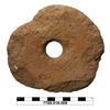 Runde, durchlochte, oxidierend gebrannte Scheibe aus sandgemagertem Ton mit glatter Unter- und leicht gewölbter Oberseite sowie abgerundetem Rand; Magerung mit "Mineralmix" entspricht der MBZ-SBZ-Keramik!Oberseite trägt Selfslip und ist mit drei Rippen in regelmäßigen Abständen versehen; Funktion? Stammen die Rippen von der Primärnutzung, die mit der Funktion als Lochscheibe nichts mehr zu tun haben, sondern sich zufällig ergeben haben?
