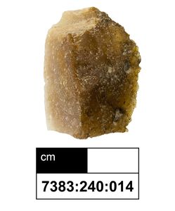 Gesteinsbeschreibung: Das Gesteinsbruchstück zeigt ungleichmäßige Farbverteilung und weist parallel zur Basisfläche eine Farbbänderung auf. Die basale Lage ist milchig weiß gefärbt. Die darüber befindlichen Lagen sind gelblich braun gefärbt und durchscheinend. Die Spitze des Grates ist dunkelbraun gefärbt und opak. Im Durchlicht ist erkennbar, daß die dunkel gelbbraune Färbung ungleichmäßig verteilt ist.