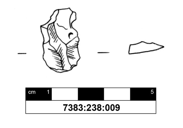 Länglicher Abschlag mit einer scharfen, unregelmäßigen Kante aus hellbraunem, entlang der Kanten durchscheinendem Silex
