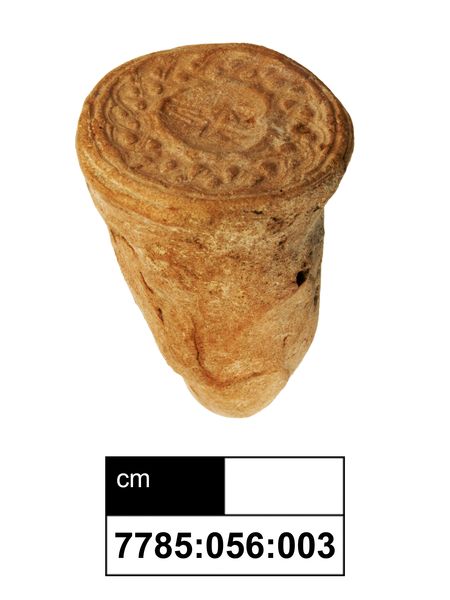 Aus feinem Ton annähernd konisch geknetete (Fingerabdrücke!) Bulle mit unten umgebogener und verklebter Spitze; runde Stempelfläche ist mit der Größe des Stempels identisch; das Siegel enthält in der Mitte mehrere Hieroglyphenzeichen, die von einem kreisförmigen Flechtband umrahmt werden. Lesung durch Jörg Klinger erforderlich; parallele Bullenform im Hethiterkatalog; Befestigung der Bulle unklar, da Schnurlöcher fehlen;