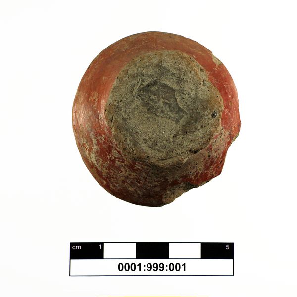 Standfuß eines rotpolierten althethitischen oder altassyrischen Gefäßes; dass es sich um einen Gefäßfuß und nicht um ein Keramikschälchen handelt, ist am rotpolierten Überzug erkennbar. Wäre es tatsächlich ein Schälchen, wäre die Innenseite rotpoliert. Da sie jedoch roh belassen ist, kann es sich nur um die Unterseite eines Standfusses handeln.