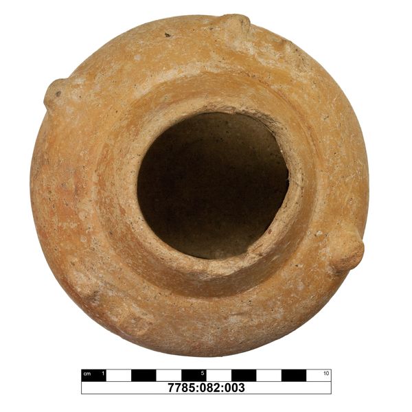Nahezu vollständig erhaltene, bauchige Kanne mit einfach gerundetem Rand, konischem Hals, durch eine schmale umalufende Rille deutlich abgesetzter Schulter, die in einen bauchigen, sich nach unten leicht verjüngenden Körper überleitet, der von einem abgesetzten Standring abgeschlossen wird. Auf der Schulter sind in regelmäßigen Abständen abwechselnd rundliche Knubben und Ösenenkel (abgebrochen) angebracht. 2,2 cm unterhalb eines Ösenhenkels befindet sich eine 1,6 x 1,3 cm große Öffnung in der Wandung, aus der ein langer, schlanker Außguß herausgebrochen sein könnte (Kanne!). Das Gefäß wurde aus einer mittelsandig gemagerten Ware sorgfältig gedreht und mit einem braunroten Slip (nur an wenigen Stellen erkennbar) überzogen, der auf der Bodenunterseite punkt- und streifenförmige Kleckse hinterlassen hat. Der Boden trägt ansonsten eine hellbraunen Selfslip. Die Gefäßform ist - ohne sie mit Fischer, Hethitische Keramik aus Bogazköy, verglichen zu haben - ungewöhnlich. Wäre die Ware lehmiger und dichter und der Überzug firnißhafter, würde man an eine hellenistische Form denken wollen.