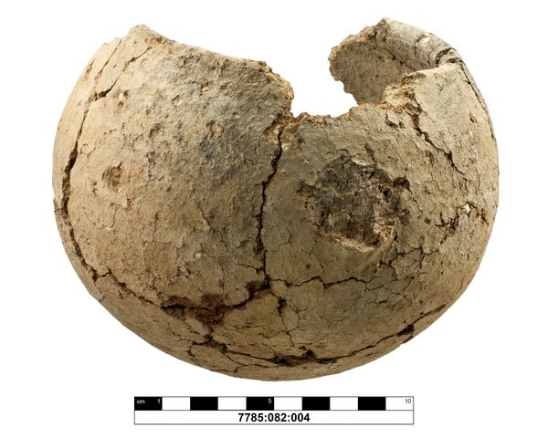 Kugeliger, grob mineralisch gemagerter Cooking Pot mit einwärts gebogenem gerundetem Rand, der nur zu ca. 40% erhalten ist; ca. 4,4cm unterhalb des Randes befinden sich die Reste einer Griffmulde(?) [Dies ist klar der Ausbruch eines Henkels]; wohl kein Henkel, da das Pendant auf der anderen Seite fehlt [da fehlt alles auf der anderen Seite, so dass die übliche zwei Henkel zu vermuten sind]; überwiegend außen und innen hellbraune, an einer Stelle kräftig braune, an zweiter Stelle graue Oberfläche;