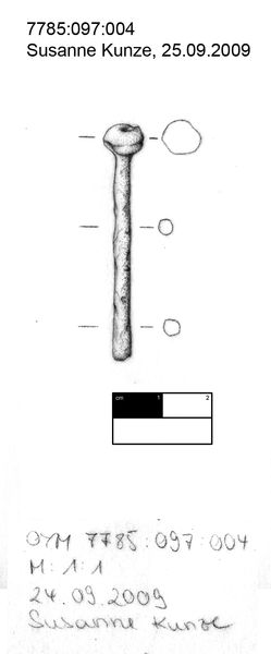 L: 4,7 cm - Dm-Kopf: 0,7 cm - D-Kopf: 0,5 cm - Dm-Schaft: 0,35 cm - Gewicht: 2,45gFragment einer bronzenen Nadel oder eines Nagels mit rundem scheibenförmigem Kopf