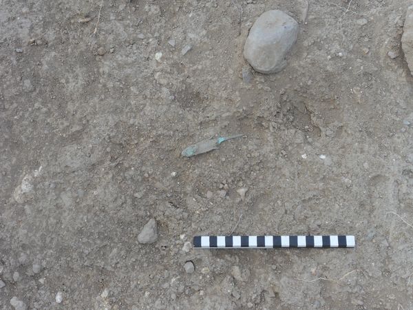 Bronzene Pfeilspitze mit Widerhaken (L: 0,8 cm), abgeflachtem Mittelgrat und oval zulaufender Spitze; ein Widerhaken ist angebrochen und leicht abgeknickt, ebenso der Schaftstiel (L: 3,7 cm; B max: 0,5 cm H: 0,2 cm), wo sich feine Haarrisse durch das Objekt ziehen; Oberfläche an der Spitze und am Übergang zum Schaftstiel einseitig stark durch Korrosionsblasen deformiert und mineralisiert; Herstellungsspuren an Widerhaken erkennbar; oberes Ende des Schaftes einseitig schwarze Verfärbungen (Pech) sichtbar.