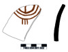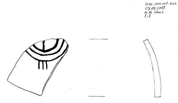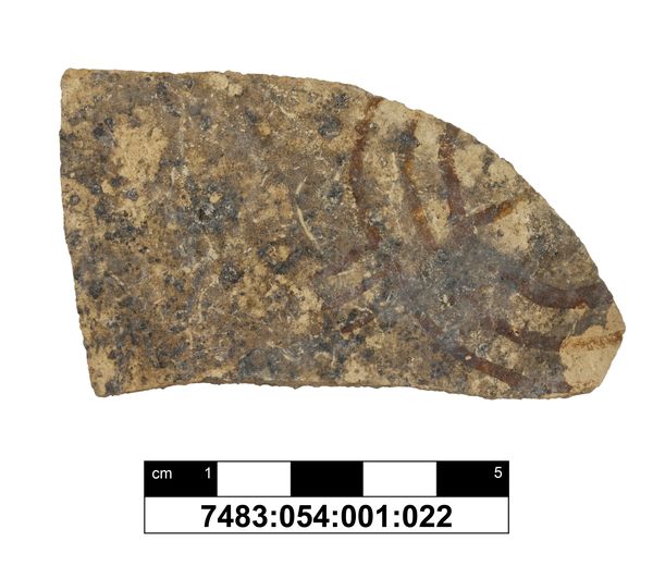 Bemaltes Wandfragment. Das Stück ist mit einer flüchtigen, rotbraunen geometrischen Bemalung versehen, die allerdings von den übrigen bemalten Fragmenten aus der Kollektion (s. Join 8, 9 und 18) abweicht: es sind drei kreisförmig angeordnete Linien zu erkennen von denen nach außen drei kurze und nach Innen eine weitere Linie abgehen. Auch diese Scherbe ist handgemacht, was deutlich an der Innenseite festzustellen ist. Sie besteht aus einem hellbraunen Ton der mittelviel mittelgroße bis große mineralische Einschlüssen hat. Die Oberfläche ist außen mit einem beigem mattem Überzug versehen der geglättet bis verstrichen wurde. Ob dieses Fragment zu einem der Gefäße Join 8, Join 9 oder Join 18 gehört bleibt unklar.