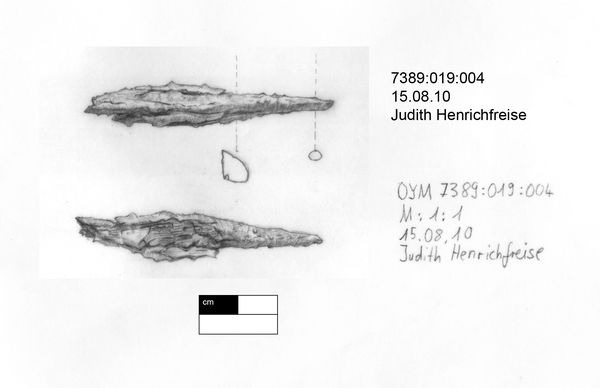 Speer(?)spitze aus Eisen, in vier Teile fragmentiert; Langseiten der Spitze ellipsoid; Durch Spaltkorrsion entstanden ziehen sich tiefe Risse längs durch das Objekt und haben den Kern in Segmente aufgespalten; Querschnitt des Blattes deshalb nicht mehr sicher zu bestimmen, evtl. rechteckig (?); Oberfläche teilweise durch Korrosionsbläschen deformiert und mineralisiert.