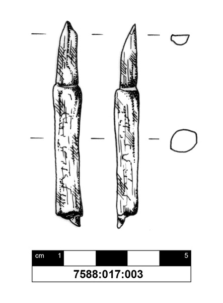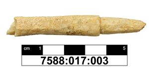 Aus Knochen geschnitzte Pfeilspitze mit schräg abgebrochenem Schaft und langer, splittrig abgebrochener Spitze; Spitze ist durch eine umlaufende Einkerbung vom Schaft abgesetzt; Schnitzspuren der Herstellung am gesamten Objekt deutlich erkennbar; spongiöse Knochenstruktur an der schrägen Bruchkante der Spitze erkennbar; die Unterseite der langen Spitze weist eine schmale natürliche Rille auf, die vielleicht als Hinweis auf einen Carpalknochen gewertet werden könnte