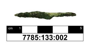 Nagel aus Bronze mit quadratischem Querschnitt; auf zwei Seiten und an der Spitze stark korrodiert; auf einer Seite befindet sich mittig eine Korrosionsblase;