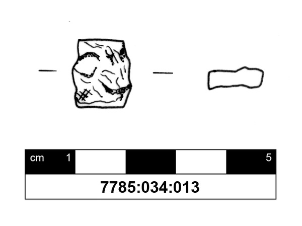 Rechteckiges, flaches Bronzeplättchen mit 3 originalen stumpfen Kanten und einer Bruchkante auf einer Schmalseite; die andere Schmalseite ist schwach konvex gewölbt; Funktion als Messerklinge wegen der stumpfen Kanten unwahrscheinlich;