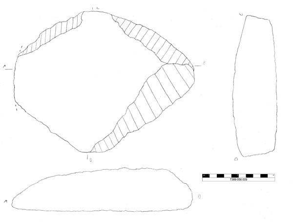 Rechteckiges Fragment eines Reibsteins aus grauem Konglomeratgestein mit auffällig geglätteter, konvexer Unterseite, die zum dünnen abgerundetem Rand hin (D: 0,9 cm) sich wölbt. An vier von fünf Kanten sind Bruchkanten mit sehr unregelmäßigen, tw. schräg verlaufenden Brüchen.