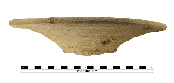 Fragmentierter, scheibengedrehter kleiner Teller aus gebranntem Ton (Munsell: 10YR 7/3). Das Stück ist unregelmäßig geformt; die Drehspuren gut zu erkennen. Die Schale besitzt einen flachen Standboden, dieser ist jedoch so unregelmäßig geformt, dass das Stück nicht gerade steht, sondern "wackelt". Die Wandung verläuft sehr flach und biegt leicht nach außen. Ihr Querschnitt ist durch den Herstellungsprozess etwas "wellig". Der Rand ist leicht verdickt und oben abgerundet. Die Gefäßoberfläche ist verstrichen. Außen auf dem Gefäß finden sich nicht beseitigte Tonklümpchen; ein Indiz für den unsorgfältigen Herstellungsprozess. Die Brandführung deutet auf Unregelmäßigkeiten hin; im Querschnitt der Wandung ist ein so genannter "Sandwich-Brand" zu erkennen: während der Kern des Gefäßes einen mittelgrauen Farbton besitzt, zeigt die Oberfläche einen beigeorangen Farbton.