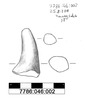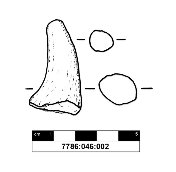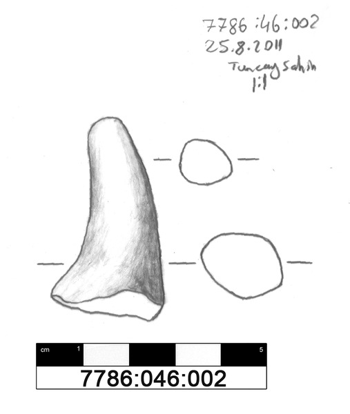M?glicherweise ein Horn einer Tierfigurine (eines Stiers?) aus reduzierend gebranntem Ton (Munsell: 7.5YR 6/3 bis 4/1). Der Ton enth?lt viele schwarze mineralische Einschl?sse von unter 1 mm Gr??e; sowie sehr wenig feinen Glimmer. Das St?ck verj?ngt sich konstant und ist leicht gebogen. Der Querschnitt des unteren, breiteren und gebrochenen Endes ist langoval, wird jedoch mit zunehmender Verj?ngung des St?ckes immer runder. Die Spitze des Horns ist abgerundet. Die Oberfl?che ist verstrichen. Die Bruchkante, sowie Teile der Oberfl?che besitzen einen mittelgrauen Farbton; ein Hinweis darauf, dass das St?ck ?berwiegend reduzierend gebrannt wurde. Nur ein geringer Teil der Oberfl?che weist einen braunorangen Farbton auf.
