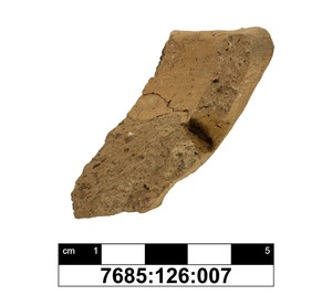 Zwei zusammengehörige Fragmente eines scheibengedrehten, vergleichsweise dickwandigen Miniaturschälchens aus gebranntem Ton (Munsell: 7.5 YR 6/4). Erhalten ist lediglich ein sehr kleiner Rest des leicht abgesetzten flachen Standbodens, sowie die nach au?Ÿen biegende, sich zum Rand verdickende Wandung. Der Rand ist oben abgerundet. Drehspuren sind Innen und Au?Ÿen auf der Geä?Ÿoberfläche zu erkennen. Erhalten ist weniger als ein Viertel des ursprünglichen Gefä?Ÿes, die erhaltenen Stücke sind au?Ÿerdem besto?Ÿen.
