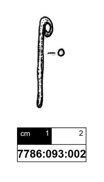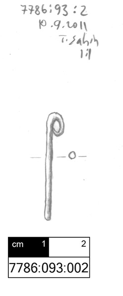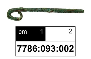 Fragment einer dünnen Bronzenadel. Erhalten ist ein Teil des Schaftes mit rundem Querschnitt, welcher sich nach oben hin verjüngt. Dessen Ende ist eingerollt, wodurch der Nadelkopf gebildet wird, welcher somit eine ovale Öse aufweist.