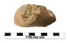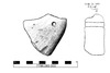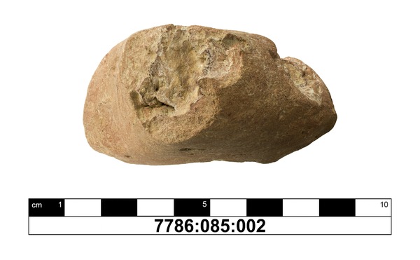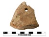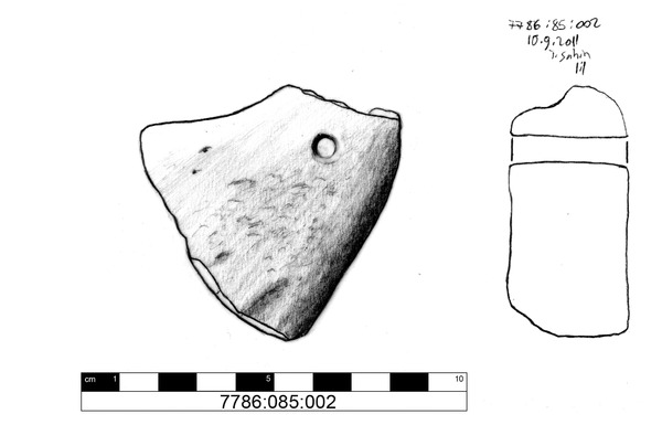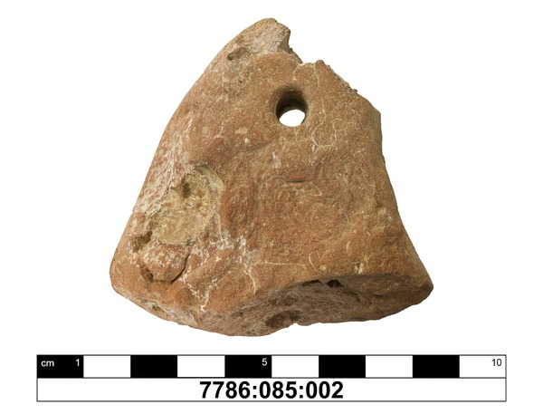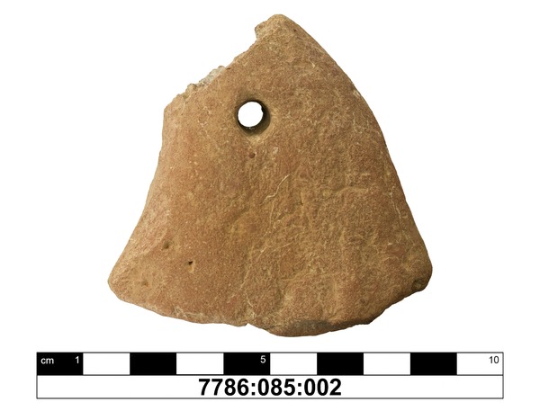 Fragment (?) eines Webgewichtes aus gebranntem Ton (Munsell: 2.5YR 6/4). Das Stück weist eine in etwa trapezartige Form auf. Die Oberseite ist glatt gearbeitet sowie abgeflacht. Zwei Seitenkanten sind ebenfalls geglättet ind konvex gewölbt. Die Unterseite ist sehr grob belassen und weist eine überaus unregelmäßige Oberfläche auf, ebenso wie die dritte Seitenkante. Die vierte Seitenkante weist ebenfalls eine sehr unregelmäßige Oberfläche auf, hierbei könnte es sich möglicherweise um eine ältere Bruchkante des Stückes handeln. 0,6 bis 0,8 cm unter dieser Seitenkante befindet sich eine Durchlochung. Die Seitenkanten der Durchlochung weisen keine Abriebspuren auf. Diese sind oftmals charakteristisch für Webgewichte, aufgrund deren Aufhängung an Schnüren. Der Ton weist im Kern der möglichen Bruchkante einen grauen Farbton auf, ansonsten erscheint das Stück gleichmäßig rotorange gebrannt. Es sind wenige, kleine Kalkeinschlüsse im Ton vorhanden.