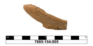 Fragment eines scheibengedrehten Schälchens aus oxidierend gebranntem Ton (Munsell: 5YR 5/6). Das Stück besitzt einen flachen, abgesetzten Standboden, auf welchem Reste des Abdrehprozesses von der Töpferscheibe zu erkennen sind. Die Wandung verläuft nach außen biegend und verdickt sich zum Rand hin. Dieser läuft eher spitz zu. Innen und Außen sind Drehspuren, sowie kleine Löcher (Dm bis zu 0,4 cm) und Rillen, vermutlich verursacht durch Ausbrennen oder Ausfallen von mineralischen Einschlüssen und Häcksel, auf der Gefäßoberfläche zu erkennen. Erhalten ist etwas mehr als ein Viertel des ursprünglichen Gefäßes.