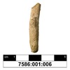 Idol aus hellbraunem, feingemagertem Ton mit relativ langem, zylindrischem Hals, der sich leicht zum (abgebrochenen) Kopf hin verjüngt , nahezu rechtwinklig abgesetzten, knuppenförmigen kleinen Schultern und einem flachovalen Körper, der durch beidseitige Einbuchtungen von den Schultern abgesetzt ist. Im Profil betrachtet ist der Hals im Gegensatz zum Körper leicht nach hinten gebogen, so als ob die Figur ihren Oberkörper herausrecken würde. Auf der herausgewölbten Vorder(?)seite befindet sich von den Schultern bis hin zu den Schlüsselbeinen jeweils eine Reihe von sieben 2-2,5mm langen vertikalen bzw. leicht schräg gestellten, annähernd parallelen Ritzungen, die vielleicht einen breiten Halsschmuck darstellen könnten. Die vertikal geritzten Bänder setzen sich über die Schultern auf den Bereich der Schulterblätter fort. Auf der Rückseite sind jeweils 4 Ritzungen pro Körperhälfte zu beobachten. Die Außenpunkte der Arme haben nahezu den gleichen Abstand, wie die breiteste Stelle des Bauches. Vergleichbare violinförmige Idole sind aus Marmor aus dem ägäischen Raum bekannt. Im vorliegenden Fall könnte es sich um eine Nachahmung aus Terrakotta handeln.
