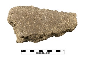 Kleines Fragment einer leicht konkav eingezogenen Reibplatte aus Andesit (Sobott 2013) mit glatter Reibefläche und etwas rauherer, aber dennoch ziemlich gerader Unterseite