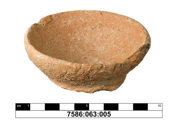 Miniaturschälchen mit leicht abgesetztem Flachboden und bauchig ansteigendem Rand, der in einem spitzen Grat endet; die Mündung ist oval, da das Gefäß "verzogen ist; wie üblich "Wackelboden", da der Boden nach dem Abtrennen vom Stock nicht nachbearbeitet wurde.