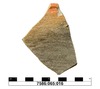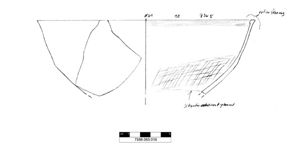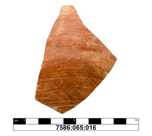 Fragment einer dünnwandigen hart gebrrannten Schale mit vermutlich gerundetem Boden und unscheinbarem, nach innen umgebogenem kantigem Rand; während im unteren Teil Drehrillen erkennbar sind, ist die obere Schalenhälfte, insbesondere an der Außenseite, ziemlich unregelmäßig und läßt eher an eine Fertigung von Hand denken. Der Scherben ist im Randbereich dünnwandig und nimmt zum Boden hin an Dicke zu. Die Außenseite ist mit einem Überzug versehen worden und kräftig rotbraun poliert, an der Innenseite wandelt sich die Farbe allmäglich von orangebraun im Randbereich über hellbraun zu graubraun und grau in der Gefäßmitte. Die Oberfläche ist geglättet, stellenweise sogar poliert.